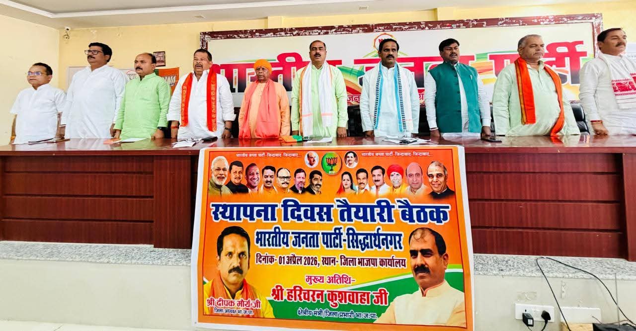 सिद्धार्थनगर। आगामी 6 अप्रैल को भारतीय जनता पार्टी के स्थापना दिवस के निमित्त बुधवार को जिला मुख्यालय स्थित पार्टी कार्यालय पर  तैयारी बैठक भजपा जिलाध्यक्ष दीपक मौर्या की अध्यक्षता में सम्पन्न हुआ। कार्यक्रम मुख्य अतिथि जिला प्रभारी हरि चरण कुशवाहा रहे। कार्यक्रम में सदर विधायक श्यामधनी राही और नगर पालिका अध्यक्ष गोविंद माधव साहित जिले विभिन्न पदाधिकारी और कार्यकर्ता व नेता मौजूद रहे।