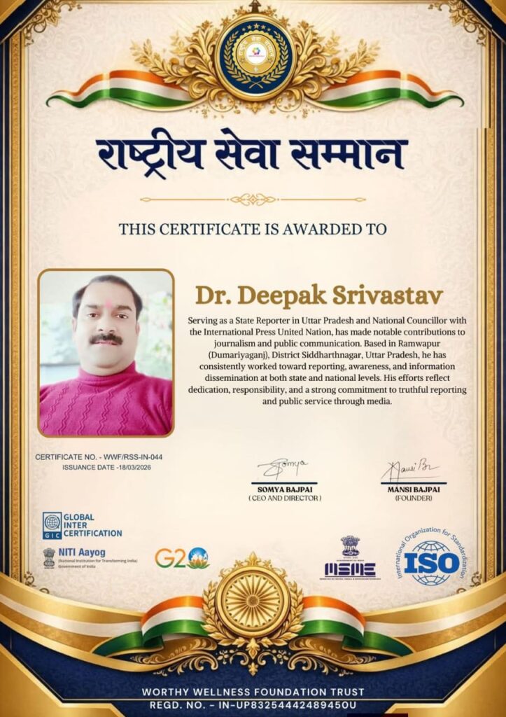 सिद्धार्थनगर। जनपद के रमवापुर उर्फ नेबुआ, डुमरियागंज निवासी वरिष्ठ पत्रकार डॉ. दीपक श्रीवास्तव को वर्ष 2026 में उनकी उत्कृष्ट पत्रकारिता के लिए तीन नेशनल अवार्ड से सम्मानित किया गया है। यह उपलब्धि न केवल उनके व्यक्तिगत संघर्ष और समर्पण को दर्शाती है, बल्कि पूरे जिले के लिए गर्व का विषय भी बन गई है।